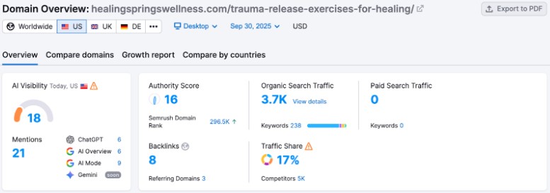 Our blog post, "Trauma Release Exercises for Healing," has emerged as a strong organic performer. Based on the latest data (as of September 30, 2025), it has achieved:
